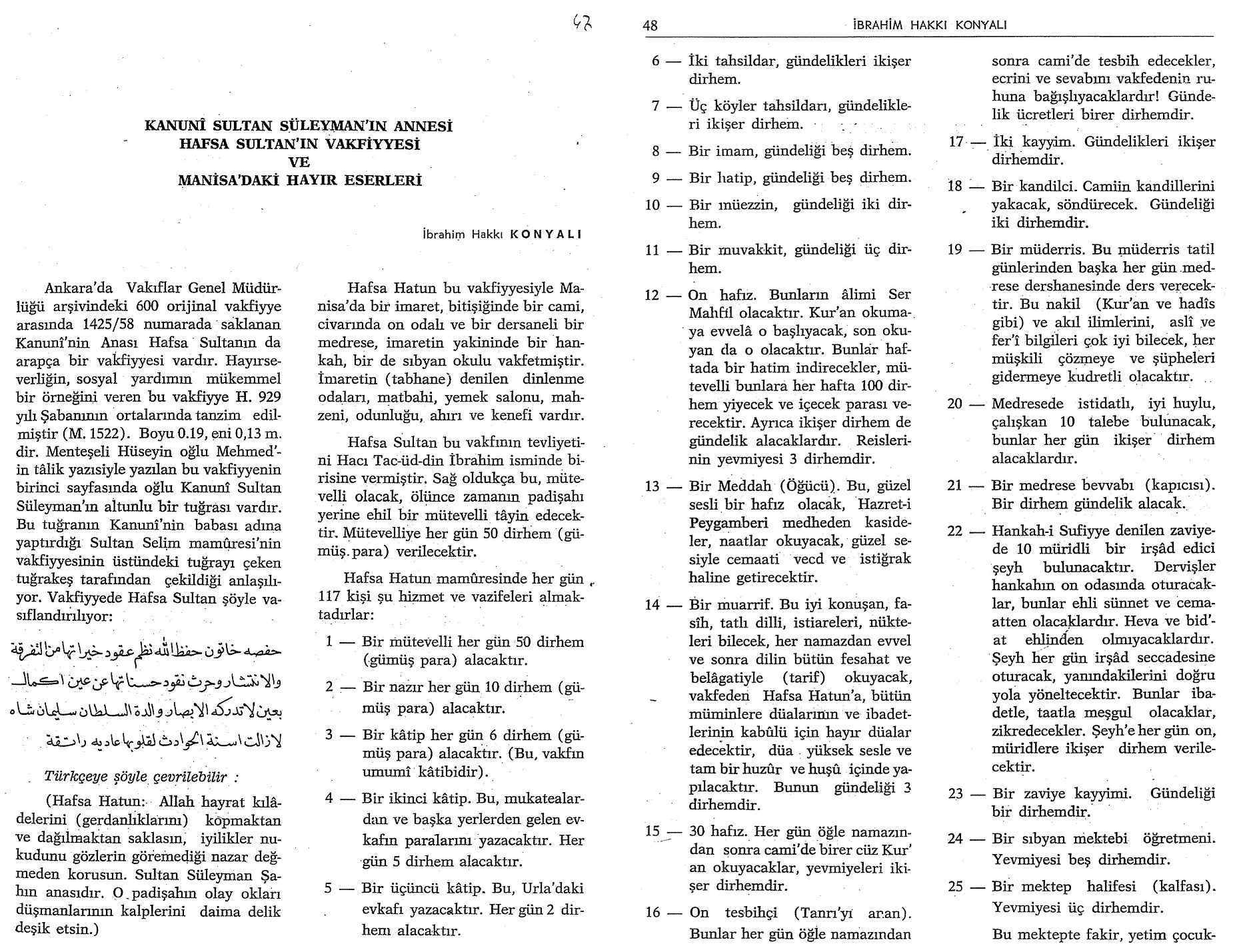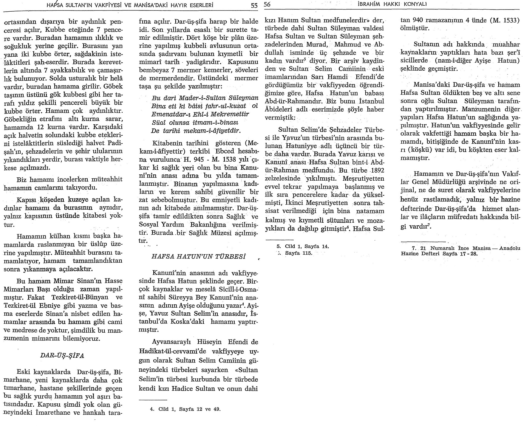 İbrahim Hakkı Konyalı'nın "Kanuni Sultan Süleyman'ın Annesi Hafsa Sultan'ın Vakfiyyesi ve Manisa'daki Hayır Eserleri" makalesini buradan okuyabilirsiniz.